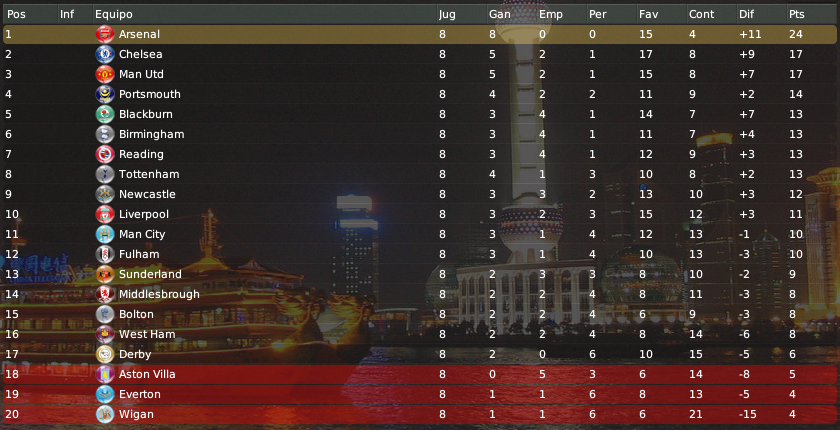 Sin embargo, y pese a que están comodamente arriba, no se deben descuidar ya que a siete unidades se encuentran dos grandes como lo son Manchester United y Chelsea que cierran los tres primeros lugares con 17 unidades. En mitad de tabla, está el Liverpool de Ron Damón Rafa Benítez que parece recuperarse del mal comienzo y con un par de triunfos se sitúa con 11 unidades en el décimo lugar.