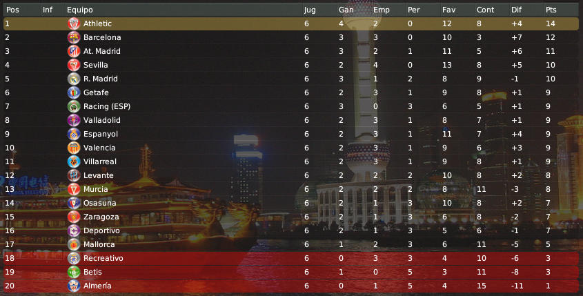 En puestos de descenso, están Recreativo, Betis y Almería. Los tres equipos andaluces empezaron con mal pie y parece que estarán condenados a sufrir esta temporada si quieren salvarse. Cierran la tabla con 3, 3 y 1 unidad respectivamente. Un poco más arriba y respirando por el momento, están Mallorca (5), Deportivo (7), Zaragoza (7) y Osasuna (7).