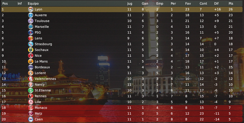 En Francia llevamos ya once jornadas disputadas y el Lyon parece que ya empieza a tomar las riendas de la Liga. Parece que ya está empezando a acomodarse en lo que será, sin lugar a dudas, una nueva temporada cómoda y totalmente a favor del equipo de Alain Perrin que tras 33 puntos disputados, se sitúa en el primer lugar, con 26 (8 victorias, 2 empates, 1 derrota).