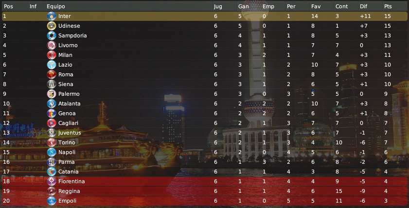 En Italia parece que la cosa está un poco más peleada ya que la punta es compartida. Están en el liderato Inter de Milán (15) y Udinese (15) que sellan sus seis presentaciones con 5 victorias y tan sólo, una derrota. Un poquito más atrás se encuentran Sampdoria (13) y Livorno (13) que sin dudas, están siendo dos de las Revelaciones de la Serie A. ¿La Juventus? Con dos victorias, un empate y tres derrotas, está 13º. En zona de descenso se encuentran Fiorentina (4), Reggina (4) y Empoli (3), mientras que, respirando un poquito más arriba están Catania (4), Parma (6) y Napoli (6). Sin dudas, se prevée una temporada complicada para muchos buenos equipos como la Fiorentina, o el Parma que están en "horas bajas".