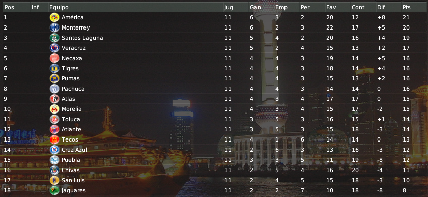 Tras once jornadas disputadas, en México tenemos a América (21) como único líder tras haber conseguido 6 victorias, 3 empates y 2 derrotas en sus presentaciones y a Jaguares en lo más bajo de la Tabla de Posiciones con tan sólo ocho unidades. Peleando por la punta también está el Monterrey (20) y Santos Laguna (19) mientras que, coqueteando con la zona baja tenemos a Chivas (11) o Cruz Azul (12) si nombramos sólo 'a los históricos'.