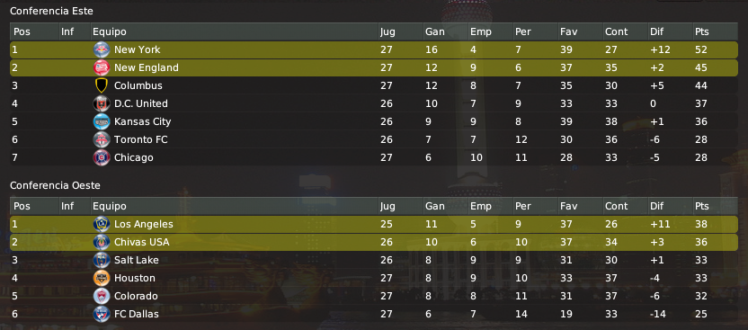 En la Conferencia Oeste, manda Los Angeles con 38 unidades. Eso sí, seguido de cerca por Chivas USA (36). Un poco más atrás quedó Salt Lake (33) mientras que, cierran la Tabla Houston, Colorado y FC Dallas con 33, 32 y 25 puntos, respectivamente.
