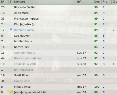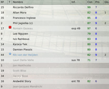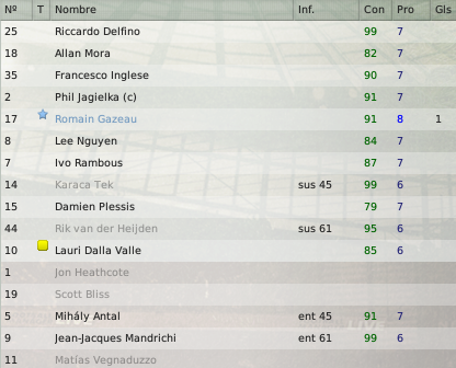 juampinob: El francés es nuestro especialista en la pelota parada. Practicamente hacemos toda la jugada para él, no hay otro que cabecee por eso hace tantos goles. Lo raro es que este tipo Gazeau tiene unos numeros buenisimos como defensor, pero su rendimiento en la cancha es bastante mediocre para tales caracteristicas. Respecto al tanque, si, tiene prometidos todos los partidos que juguemos por copa. Seguramente la delantera será Mandrichi-Vegnaduzzo.