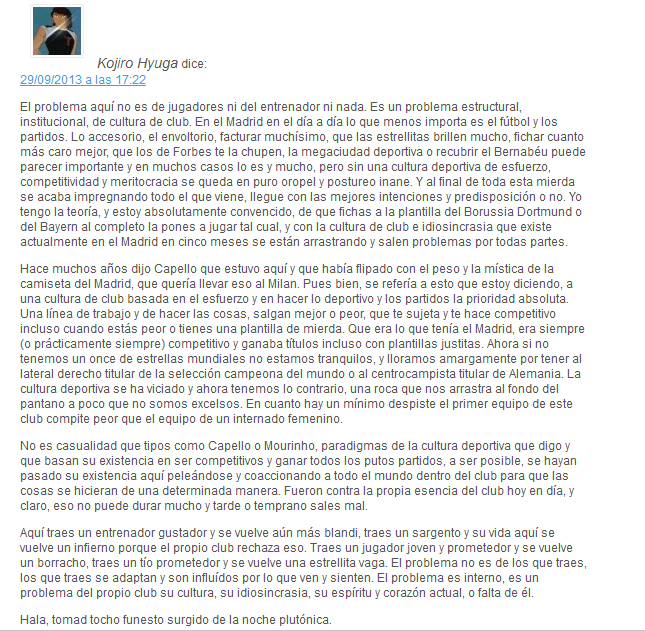 Probablemente la mayor muestra de equipo grande y dominador venido a menos, y que sigue viviendo de su pasado, fuimos fuimos...9 copas de europa y mejor equipo del siglo XX... y así.