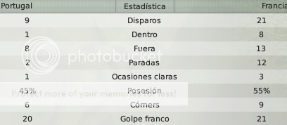 Mientras que Portugal mostró un futbol mesquino, con poco atrevimiento y donde sus figuras no aparecieron en ningún momento, Ronaldo fue un fantasma en cancha sólo una jugada personal que no terminó en buen puerto fue el aporte del jugador del United, Nani por otro lado tuvo tiro en el larguero pero estuvo muy involucrado en tareas defensivas y en auxiliar a Manuel Da Costa por la banda izquierda. Los Portugueses en los últimos 15 minutos mostraron intenciones de llevarse el partido y se creía que iban a levantar, pero nada, ya que en el 2º tiempo y la prorroga fue todo de color Le Blues.