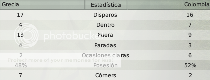 En el tiempo extra justo antes de que termine la primera etapa Andrés Caldas aprovecha un rebote que dejó un mano a mano entre Morales y el meta Sifakis para sacar un remate potente desde la cercanía de la media luna. El complemento fue muy friccionado y peleado, con Grecia ubicando 4 delanteros y Colombia intentando aprovechar una contracarga. En la última jugada Samaras mete un centro cuando la pelota se iba despidiendo de la última línea, aparece Amanatidis que pone un cabezazo que se estrella en el vertical nadie lo podía creer, cuando la pelota no quiere entrar a tu favor, no entra y así fue Grecia se puede despedir de esta Copa del Mundo con la cabeza en alto, jugaron a gran nivel durante la fase de grupos y en octavos jugaron un partidazo.