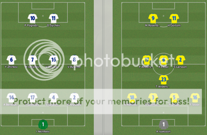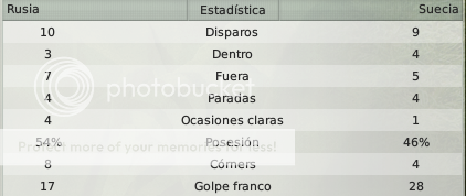 Mientras que Rusia no se hacía muy presente en los ataques pero cada vez que Zhirkov desbordaba provocaba mucho peligro a la selección sueca que además tenía a Pogbrenyak como referencia de ataque pero el resto del equipo no destacó en demasía.