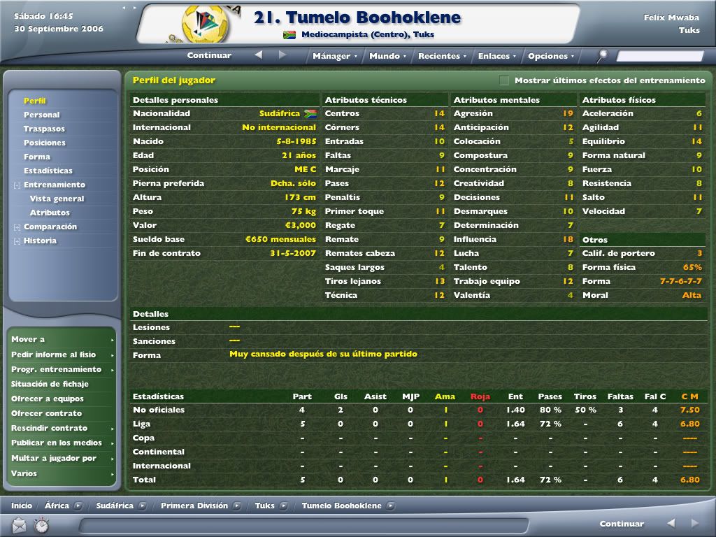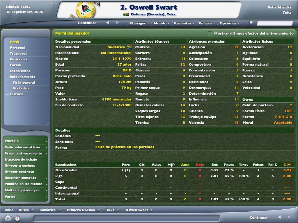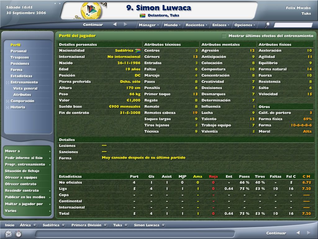 chapon_shakur: Wola!! Bienvenido a la historia! La verdad es que si, la primera temporada fue bastante bien. Conseguimos un tranquilo 7º puesto, salvandonos con solvencia y sobradamente. Ahora, en la segunda, estamos marcados por la gran inversion hecha para tener buenas instalaciones de entrenamiento y tuvimos que vender a muchos jugadores interesantes. ademas, debido a los problemas economicos no pudimos traer entrenadores buenos ni grandes fichajes de modo que nos hemos quedado un poco estancados, pero tranqui! Felix Mwaba lo tiene todo bajo control. Ya termine la temporada y a ver si pronto posteo la ultima actualizacion y veras el rendimiento que sacamos... Saludos y gracias por seguir la historia!