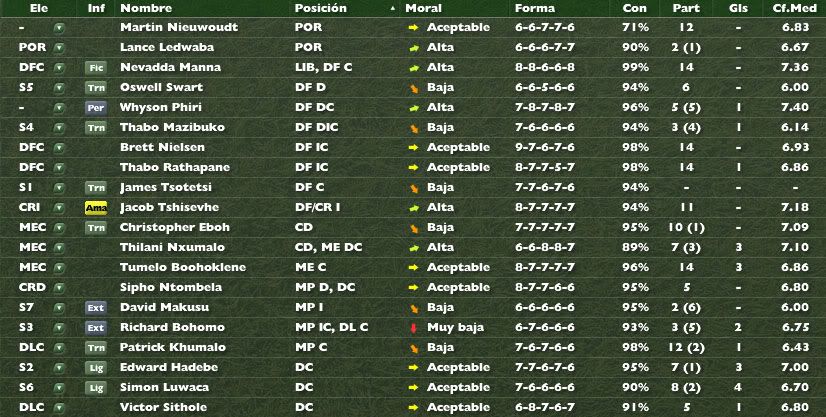 Tenemos entonces 19 jugadores. Acaban contrato los juveniles Mnguni, Vilakazi y Majola, y el veterano Dikana. Estos jugadores no renovaran contrato y se les dara la carta de libertad. Con estos jugadores no se puede ingresar dinero alguno, de modo que tendremos que vender a alguno del resto. Se ponen en venta todos los jugadores menos Nieuwoudt, Manna, Tshisevhe y Hadebe. Llegan ofertas por pocos jugadores cerrandose las ventas del maximo goleador del equipo la temporada anterior, Sebola, y de Makala, el que iba a ser nuestro jefe en el centro del campo. Dos bajas muy importantes. Ademas tengo que indicar que llegaron ofertas por los intrasferibles Nieuwoudt, Manna y Hadebe. Por los dos primeros las ofertas fueron irrisorias. Hicimos contraofertas pero fueron rechazadas. Por Hadebe recibimos otra oferta que tratamos de negociar, pero al final, tras la venta de nuestro killer Sebola decidimos mantenerlo hasta navidades. La oferta llegó hasta los 1.1 millones, pero una vez el jugador mostro publicamente su deseo por quedarse decidimos mantenerlo y tratar de resolver el problema economico de otro modo. No obstante repito, es probable su marcha en el paron navideño. Indicar a su vez que el resto de jugadores, si bien no estan publicamente declarados trasferibles, si esta abierta cualquier negociacion por su marcha.