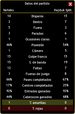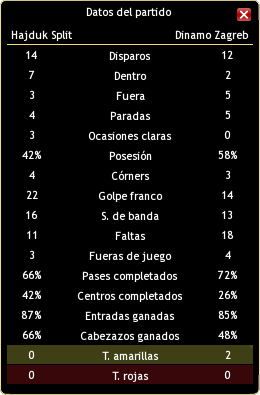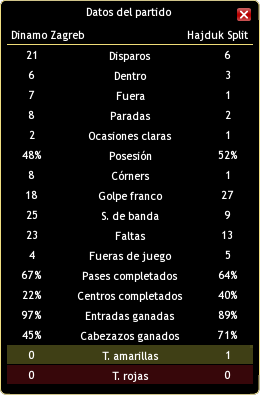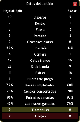 Rápidamente nos dimos cuenta de que la eliminatoria sería nuestra, ya que funcionó a la perfección el 4-3-2-1 que planteé para este partido. Gracias a él, dominamos claramente el balón y, pese a que lo intentaron, sus ataques eran más fruto de la desesperación que otra cosa y eran nuestras contadas ofensivas las que realmente ponían en peligro el marcador. Visto esto, los locales volvieron a recurrir al juego duro que, ante la permisividad arbitral (terminaron el partido sin ver ni una amarilla) llevó a Seric a la enfermería.