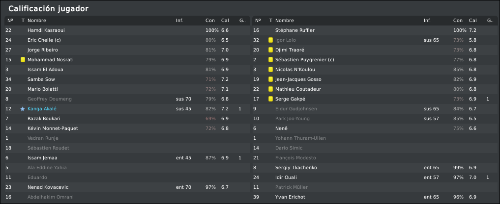 De hecho, nos zurraron como nunca en este partido, y prueba de ello son las siete tarjetas amarillas que recibió el equipo rival. Al menos no consiguieron intimidar a Sow y Bolatti, que siguieron ejerciendo su función de destruir y organizar con bastante eficacia. Por desgracia, no siempre puede haber final feliz, y el Monaco acabo logrando el empate de la manera más tonta: Sacamos un córner contra ellos, el balón es despejado, le cae a Chelle, y éste en vez de echarla fuera o seguir hacia adelante, retrasa hacia nuestro campo. Ouali la intercepta, se planta sólo ante Kasraoui, le regatea y marca a placer. Grave error que nos cuesta dos puntos, pero me quedo con la sensación general del equipo, mucho más sólido que en partidos anteriores.