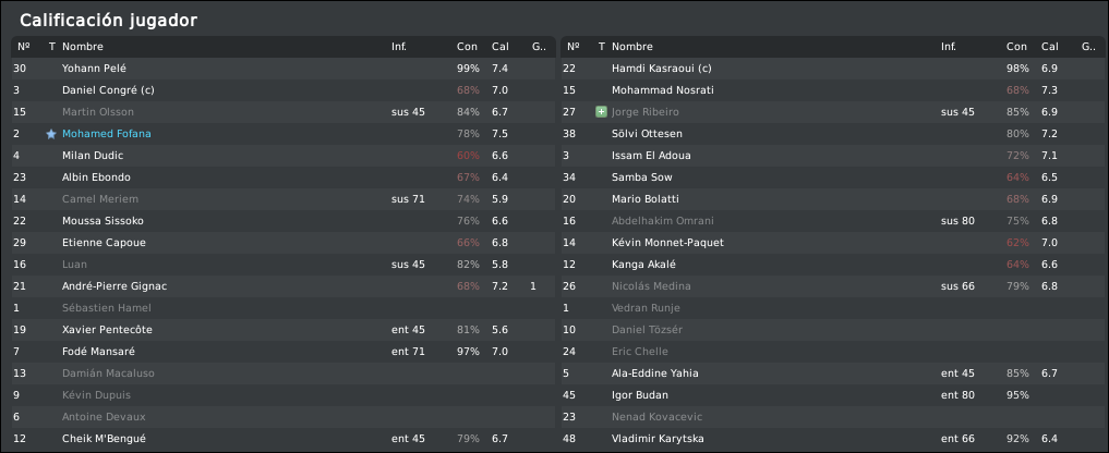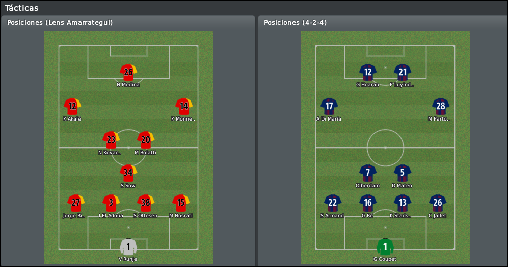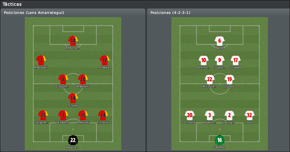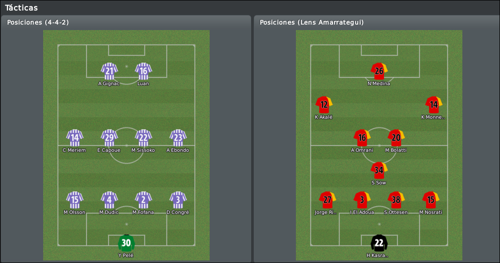 Nosotros mantenemos el esquema defensivo de los últimos partidos, aunque seremos algo más atrevidos con el ataque. Adelantamos la posición de los interiores para usarlos como extremos hacia dentro, con la idea de que apoyen el juego de Monnet-Paquet con pases cortos y desmarques, en vez de buscar el centro a la olla. Detrás, Sow tendrá la única misión de secar a Gudjonhsen, mientras que Bolatti y Doumeng ejercen como organizador y llegador respectivamente. No quiero hacer cambios en la defensa para tratar de conseguir algo de regularidad, veremos si no me obligan los jugadores con alguna de sus cagadas habituales.