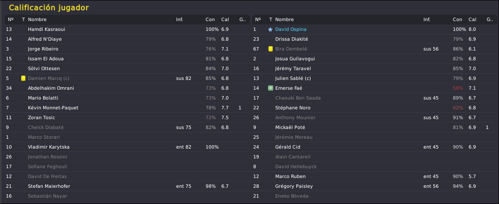 Por desgracia, enfrente teníamos a un porterazo, el colombiano Ospina, que detuvo todo lo que le lanzamos, y se anticipó constantemente a Diabaté. Definitivamente, voy a tener que plantearme el fichar a este chaval, porque pronto será uno de los mejores porteros de la Ligue 1. Sobre el resto del Nice, destacar la labor de su doble pivote Que luchó bienc otnra Omrani y Bolatti; y resaltar otro buen partido de la defensa, que sólo tuvo el error del gol de Poté, el resto del tiempo estuvo impecable. En fin, mal resultado enc uanto a puntos, pero me gustó el juego del equipo, la verdad. Creo que este partido es una señal inequívoca de como ha cambiado el equipo respecto al año pasado.