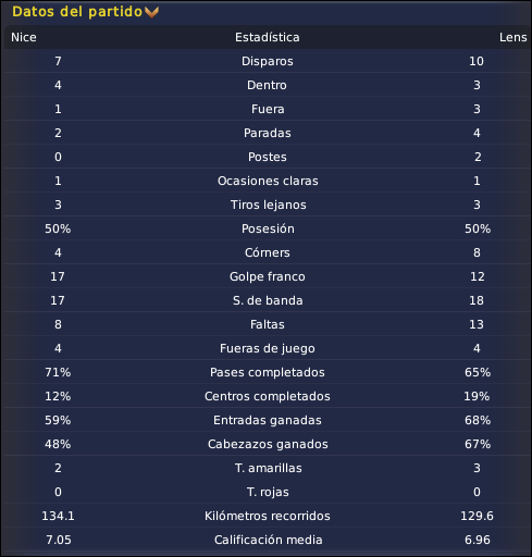 Tras el descanso, parece que la lesión de Tosic nos afectó bastante y el Nice ganó la pelota, llevándola con facilidad a su línea de tres mediapuntas. Aquí surgió alguien a quien nada esperaba, el georgiano Makaridze, que hizo varias paradas meritorios, condenando el partido al 0-0. O al menos eso parecía hasta los últimos minutos, en los que, animados por la ambición, nos vinimos arriba para tratar de quebrar la defensa de los de Niza. Justo en la última jugada del partido nos vinimos todos arriba, dejando espacio para que Adeílson recorriera 60 metros y acabara rematando a gol. Tres puntos perdidos en un minuto, definitivamente este Nice se nos atraganta siempre... Aumenta la presión sobre nosotros, y tendremos que sacar aun más puntos de los últimos cuatro partidos.