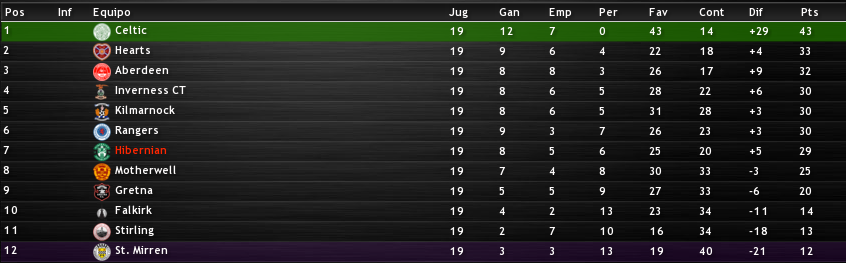 La superioridad y hegemonía del Celtic en la competición se hace evidente, sus diez puntos de diferencia con el segundo clasificado, nuestros máximo rivales, el Hearts, colocan a los católicos a un nivel por encima del resto, incluido el Rangers. Nuestra trayectoria en la Clydesdale Premier League, se puede cerrar, por el momento, con un paso algo dubitativo e inconstante. Los buenos resultados que obtuvimos en la pretemporada nos dieron un gran exceso de confianza, yo también me incluyo como principal culpable. La victoria en la primera jornada frente al Rangers, nos dio aun más confianza, y acabamos pecando por falta de humildad. Hay que ser egoístas y exigentes, pero nunca olvidando de dónde venimos y quienes somos. Como los resultados atestiguan, nuestra trayectoria se resume de bien a mal e irregular, sin concretar un criterio medio. Estamos a mitad de temporada y aun hay tiempo de poder reconstruirse sobre los mismos cimientos. Como dice el dicho, Roma no se construyo en un día, sino con trabajo y esfuerzo.