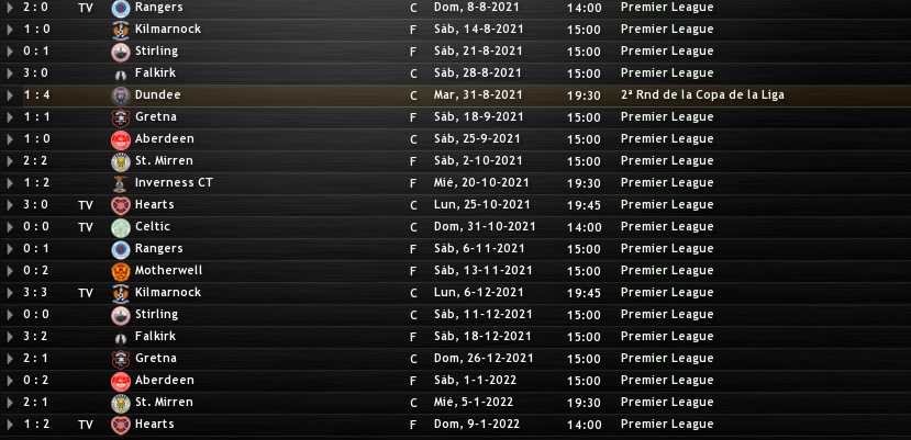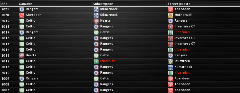 Llegamos a la segunda linea escocesa, a esa formada por los equipos que sueñan con quitarles el poder a Celtic y Rangers, trabajo duro conseguir algo mas que las migajas de esos dos, pero bueno, veremos que tal lo haces.