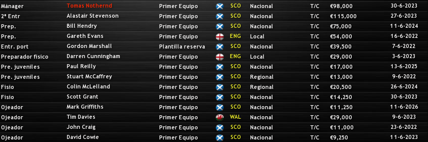 Para no crear un cierto desconcierto, decidí no cambiar el aspecto técnico y he mantenido al mismo bloque que había permanecido con el anterior técnico. Confiando plenamente en Alastair Stevenson, segundo entrenador. Alastair lleva en el club muchos años y eso nos permite conocer al club y saber con amplitud que se necesitaba o no realmente en el primer equipo. Por lo que en resumen al menos durante esta temporada se mantendrá este mismo bloque de trabajo.