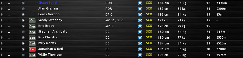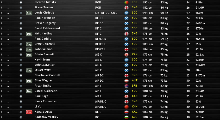 En el medio campo tenemos a jugadores muy importantes y sobre todo determinantes. El canadiense Edwin Barnett de 28 años es nuestro mejor medio, jugador con una importante visión de juego y excelente recuperador, además de poseer un potente disparo lejano. John McKellar sería su compañero que compagina las labores prácticamente de destrucción, fruto de la cantera, a sus 23 años puede despuntar como un excelente centrocampista. En las bandas se cuenta con dos excelentes extremos diestros, aunque McConnell, esta un paso por encima del austriaco Wagner, algo lento. En cambio Charlie posee un excelente regate y remate. En la izquierda contamos con tres jugadores, a cual mejor. Bulku es la única incorporación que hemos realizado, llega procedente del Celtic y es un jugador de refresco, pues no habrá discusión de que Paul Page, es quizás de lo mejor del equipo. El canadiense es un especialista en centrar balones a sus compañeros y novias no le falta. Por detrás estaría Daniel Galbraith, aunque su condición de ambidiestro permitiría que actuase en cualquiera de las dos bandas.