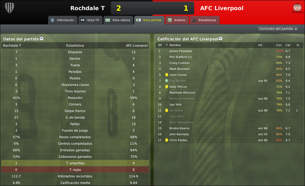 El equipo de Brown comenzo bien el partido compartiendo el dominio del balon con el local, pocas jugadas de riesgo se habian generado cuando a los 14 minutos en una jugada desafortunada donde Bloxham quizo ceder de cabeza a Fossdyke el central marco en propia meta para poner en ventaja al Rochdale T. El AFC Liverpool reacciono bien al infortunio y comenzo a jugar mucho mejor que el equipo local y llego al empate a la media hora de juego con Orme, parecia que la visita no tendria problemas para encaminar el partido y asi lo hacia ver en los primeros minutos depues del gol, pero a los 37 Whyte puso el 2-1. El conjunto de Brown no bajo los brazos y siguio buscando el empate durante todo el partido, pero aun teniendo las chances y mereciendo como minimo el empate termino sufirendo la primera derrota de la temporada.