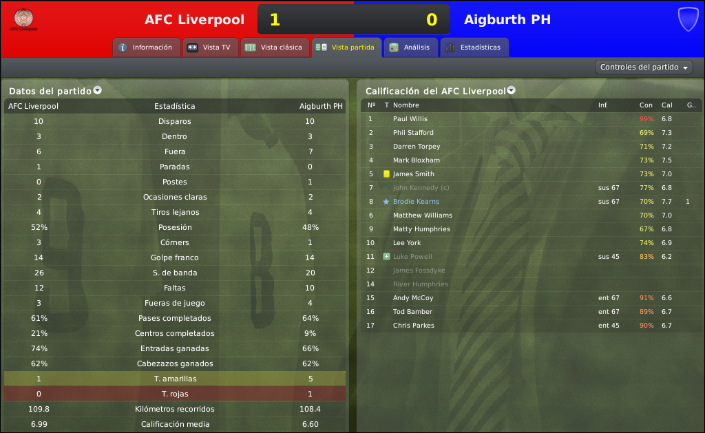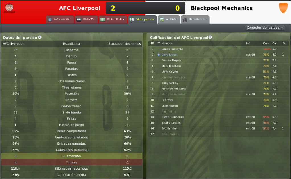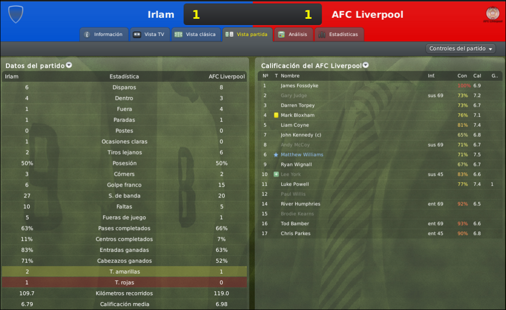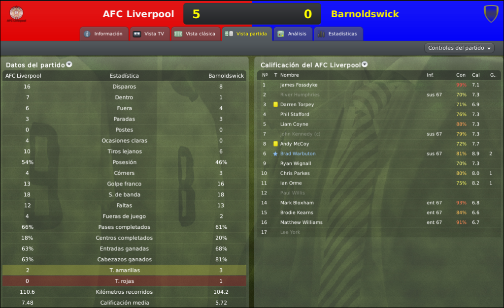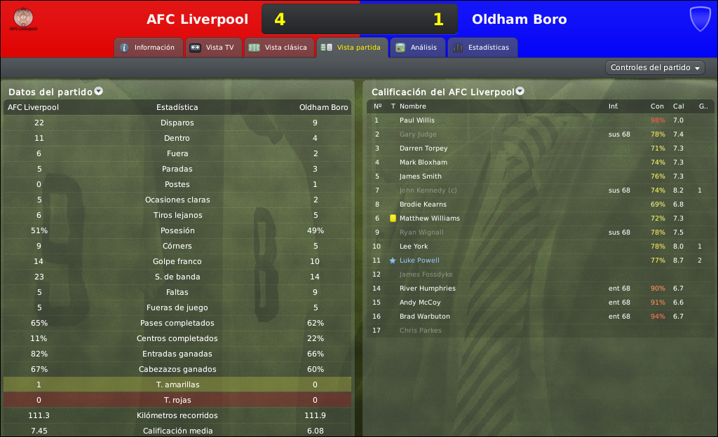 Se me ha pasado un monton de tiempo con esto de las fiestas y has avanzado mucho. La marcha del equipo parece muy buena y los jugadores en general lo hacen bien , seguramente esperaba mas de York que pensaba que podia marcar una diferencia. Finalmente no llego el tercer refuerzo o me lo perdi en algun lado?. De todo lo que ha pasado en este comienzo de temporada destaco dos cosas , la gran goleada que le metiste al lider Oldham y por ultimo el partido de copa que no pudo ganarse en casa que merecimos ganar claramente. Mucha suerte xD