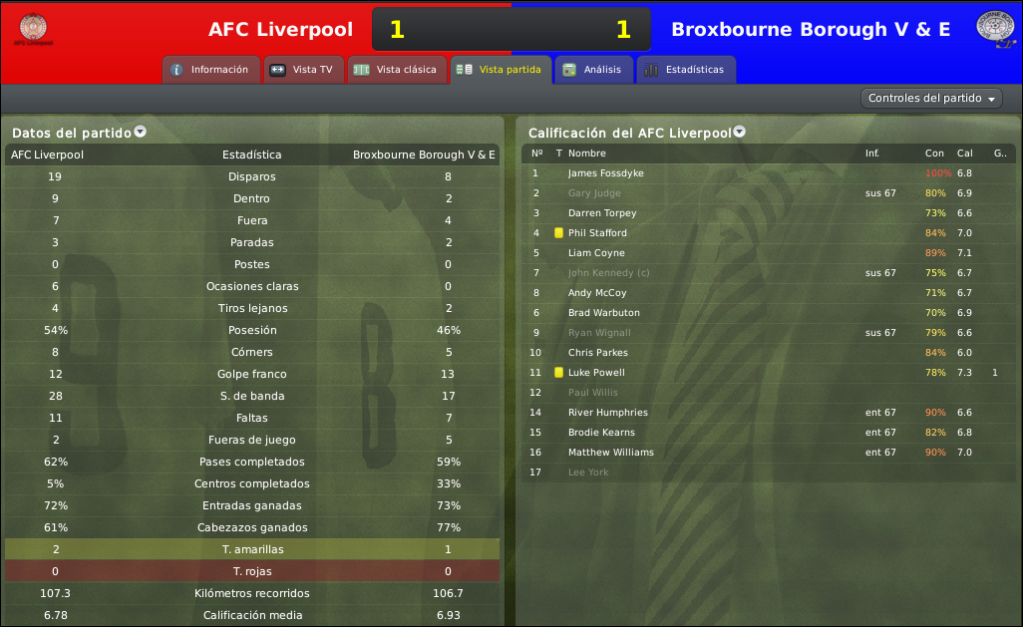 El equipo Scouse de local se hace muy fuerte, pero pocos esperaban que ante un fuerte equipo como el Broxbourne Borough V & E pudiera seguir haciendose fuerte de local. Pero el equipo de Brown jugo un gran partido, uno de los mejores en lo que va de la temporada, lamentablemente los delanteros no estaban en su mejor noche, en especial Parkes que en la primera parte perdio varias ocasiones. En el complemento el AFC Liverpool siguio siendo mucho mas y merecia la victoria, pero la visita logro ponerse en ventaja a los 51 minutos con Mitchell. Era mucho mas que injusto, pero lejos de desanimarse, los Scousers no cesaron buscando el gol que finalmente marco Powell a los 77. El empate estaba bien y asegura un partido de repeticion, pero el equipo de Brown siguio buscando y merecio la victoria que finalmente no llego. Ahora en 4 dias debera visita Broxbourne y en el Goffs Lane buscara lo que no pudo conseguir en casa.
