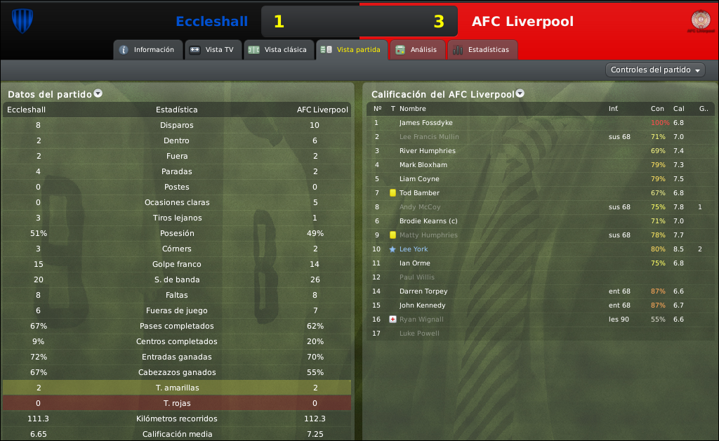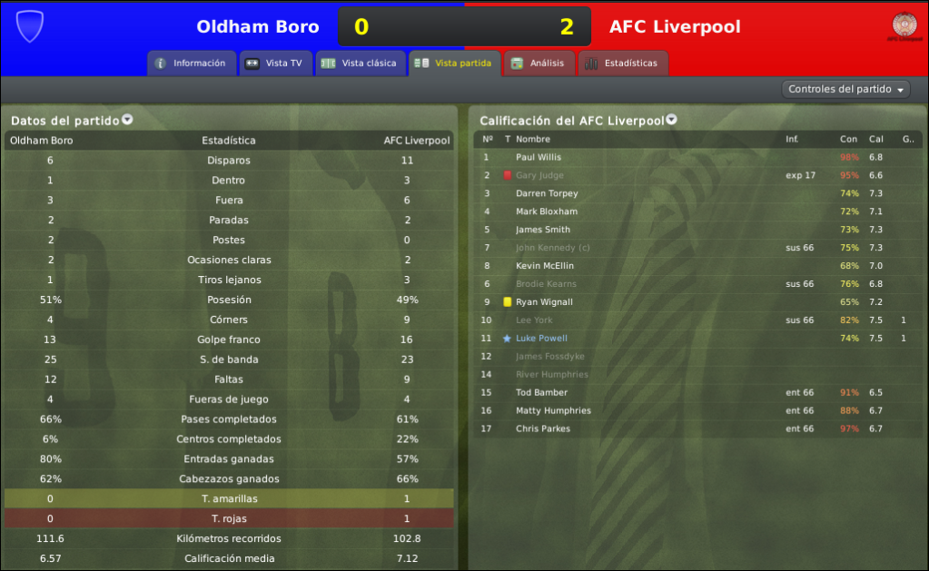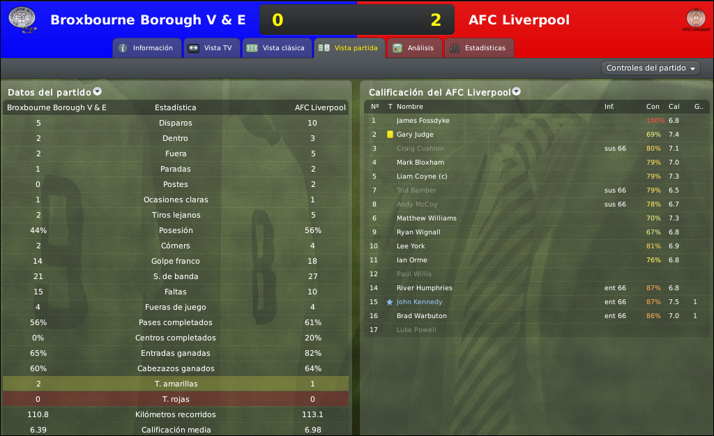 Las cosas no comenzaron bien para el equipo Scouse, por que en un tramite parejo del partido, rapidamente a los 17 minutos el equipo de Brown se quedo con 10 hombres por la expulsion de Judge, el manager decidio jugarsela y no perder protagonismo, pasando a defender solo con 3 jugadores. La apuesta era arriesgada pero a Martin Brown le salio a la perfeccion, en un poco mas de 15 minutos gracias al buen momento de sus delanteros, especialmente de York, el AFC Liverpol se puso arriba 2-0. Por mas que quedaban casi 60 minutos por jugar el resultado ya estaba cerrado, la visita se dedico a controlar el partido y asegurar el pase de ronda en otra copa mas.