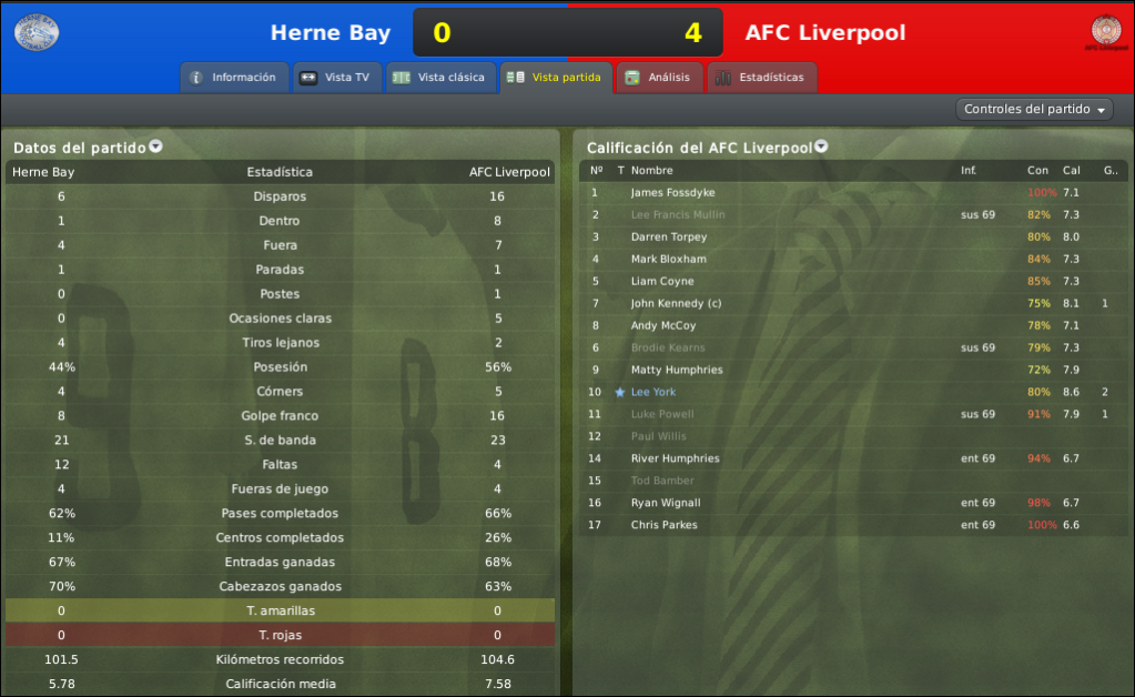 Seguramente ninguno de los 116 espectadores que se reunieron en el Winch's Field estaba preparado para lo que termino viendo. Los primeros 45 minutos fueron una tormenta roja que arraso Herne Bay, el AFC Liverpool dejo boquiabiertos a todos y con un recital de futbol ofensivo liquido al equipo local propinandole 4 goles en la primera etapa, comandados por el espigado York el conunto Scouse destrozo animicamente al Herne Bay y dejo la segunda parte solo para cumplir con el reglamento, incluso pudo el equipo de Brown haber ganado por una diferencia mayor. La victoria deposita al AFC Liverpool en 2º Ronda del FA Vase algo impensado a comienzo de temporada, ademas el club embolso 1.100 €.