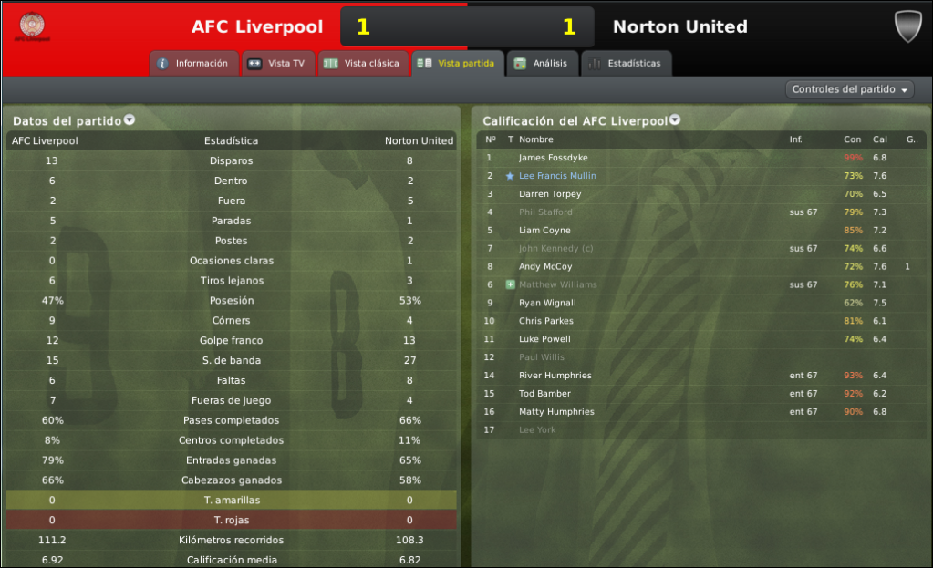 El rendimiento Scouse de la primera parte no fue el mejor, los circuitos de juego se ensuciaban, la pelota no salia limpia y el equipo local aun siendo mas genero muy pocas situaciones en el primer tiempo. En la segunda parte el AFC Liverpool mejoro mucho pero no se mostraba como el equipo contundente que solia verse en el Valerie Park. Aun no jugando bien se puso por delante con McCoy a los 67 minutos y parecia que se terminaria llevando una victoria deslucida pero que sumaba 3 puntos igual. Pero despues del gol el equipo de Brown se durmio, dejo que el Norton United empatara rapidamente y no logro reaccionar en los 20 minutos restantes del partido, no ganando por primera vez en la temporada por la liga.