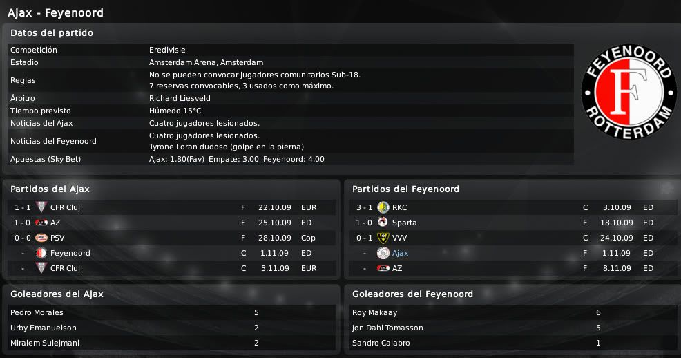 Parece increíble que estemos solamente en Noviembre. El Ajax recientemente ya ha tenido que llegar a la tanda de penalties para eliminar al PSV en Eindhoven en Copa, que sudar y sufrir hasta el último momento para ganar al AZ en Alkmaar, y ahora seguido llega nada más y nada menos que the Klassieker, el partido más importante de Holanda y que para colmo determinará quien se coloca como líder en la Eredivisie. Respecto a los jugadores que van a participar en el encuentro, destaca por encima de todos la presencia de Suk. El delantero canterano asiático de 18 años de edad se verá con la responsabilidad de ser el delantero del equipo en un partido de esta importancia, puesto que tanto Suárez como Sulejmani se encuentran lesionados. La verdad es que el partido no ha llegado en buen momento para el equipo de Rijkaard: Sulejmani, Suárez, Vertonghen y Van der Wiel, 3 titulares y otro habitual, no podrán disputar el encuentro. Retomando la alineación del Ajax, además de la presencia de Suk, hay que hablar también de la participación de De Zeeuw por delante de Eyong Enoh. La intención es dotar de una mayor fuerza al centro del campo para resistir mejor los posibles ataques del equipo de Rotterdam. Además, gracias al buen toque tanto de Enoh como de De Zeeuw esta innovación no supondrá un gran perjuicio en tareas ofensivas. Por lo demás, Emanuelson y Morales acompañarán en ataque, Skjelbred será el jugador más ofensivo en el medio, y la defensa se mantiene intacta con la presencia de Anita, Ogararu, Jorgensen y Alderweireld. En lo que respecta al Feyenoord jugarán con un 4-1-3-2, renunciando a las bandas y fortaleciendo el medio. El joven Bisewar aportará talento, mientras que Landzaat, El Ahmadi y Leerdam tratarán de aportar solidez. Así, casi todo el peso ofensivo recaerá sobre dos veteranos como Tomasson y Makaay. De esta manera, a priori, el Feyenoord no hará gala de un fútbol muy ofensivo y en ataque sus opciones pasarán por las botas de los dos veteranos delanteros. El Ajax tendrá que controlarlos bien y hacer un marcaje especial a Bisewar, sin duda alguna el jugador del centro del campo del Feyenoord que puede marcar la diferencia. Asimismo, Landzaat también tendrá que ser seguido de cerca debido a su capacidad para asistir.