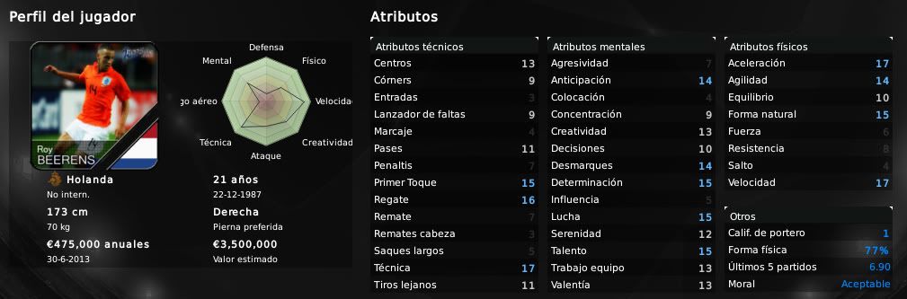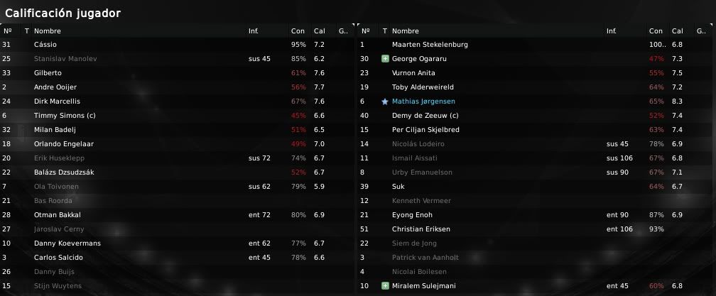 Bienvenido compañero! Metiéndonos de lleno en la historia, la verdad es que los últimos partidos no están yendo como nos gustaría a todos. El equipo gana casi por inercia, pero no porque lo merezca. La suerte y la calidad nos están dando muchos puntos pero supongo que eso algún día se acabará y todo no nos irá tan bien. Aún estamos a tiempo de remediarlo pero la verdad es que no conseguimos sacar esto adelante. El equipo se muestra falto de intensidad en muchas ocasiones, haciendo gala de una enorme relajación. Es cierto que en muchos tramos el equipo realiza un buen fútbol, rápido e intenso, pero no consigue mantenerse constante y los rivales acaban poniéndonos en aprietos. Aun así, los resultados de momento son formidables y en el fútbol ya sabemos que lo que manda es esto. En la Eredivisie tenemos el liderato a tiro y llevamos un vagaje francamente bueno. En la Europa League, aunque hemos empatado los tres partidos, el único mal resultado para mi gusto es el cosechado en Rumanía contra el Cluj. El primero fue en Ámsterdam contra el Fenerbahçe, equipo que considero algo superior al nuestro y con un jugador como Güiza marcando la diferencia. El segundo fue en Alemania contra el Hertha, equipo bastante parejo a nosotros y teniendo en cuenta que fue en el país germano no creo que puntuar allí se pueda considerar como negativo. Pero como ya digo, el empate contra el Cluj no se puede aceptar, y menos de la forma que se produjo. De todas formas, como ya digo, lo que mandan son los resultados y de momento nos están favoreciendo. Ahora nos queda tratar de ir mejorando el juego poco a poco y comenzar a ganar los partidos con más solvencia. No hay que olvidar que esto es también un proyecto a largo plazo, fundamentado en las piezas de la cantera con las que contamos y que estamos intentando amoldar a un sistema exigente y complicado como lo es el clásico 4-3-3 holandés.