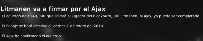 Ya era hora de cerrar a Kanu y a Litmanen! La verdad es que la llegada de ambos me ilusiona bastante, pues lo veo como el primer paso importante de cara a recuperar lo que pretendemos: esa forma de jugar, esa identidad que tenía el Ajax, y ese prestigio y títulos que consiguieron Jari y Kanu entre otros jugadores. Económicamente no nos ha supuesto demasiado y además hay que recordar los ingresos por Atouba o Pantelic entre otros. Esperemos que se integren bien y que actúen como dos entrenadores más, ayudando a Rijkaard y tutelando a los chavales, que en la mayoría de ellos apenas llegan a los 24-25 años. Por otra parte, contra el Twente, estuvimos cerca de estropear una gran primera parte pero por suerte apareció Emanuelson para hacer pleno y ganarle al otro grande que nos quedaba. La verdad es que todo marcha muy bien y parece que después de unas semanas algo dudosas esto empieza a aclararse gracias a los resultados y al juego. Un saludo!