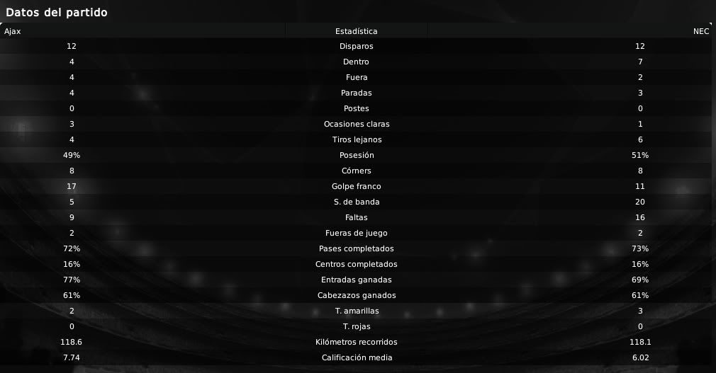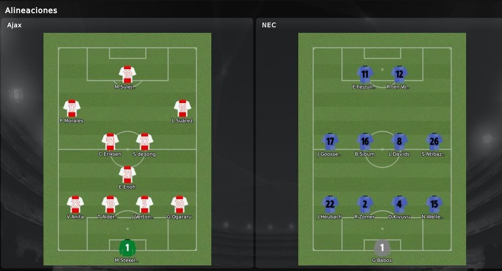 El Ajax llegaba a este nuevo encuentro de la Eredivisie dispuesto a enmendar el pinchazo cosechado en el partido anterior y vaya si lo hizo. De manera similar a como ocurriera frente al Cluj rumano en la Europa League, los de Rijkaard desplegaron un vendaval de fútbol en la primera media hora que hizo que el NEC se fuera el descanso con un 3-0 en contra que daba por finiquitado el encuentro. Eficacia, ritmo alto, velocidad... son algunas de las características que se quieren implantar de nuevo en la entidad y que sin duda se vieron reflejados en el día de hoy. De la mano del jóven Christian Eriksen como organizador, Luis Suárez y Pedro Morales alcanzaron un nivel formidable y en todo momento pusieron en jaque a la defensa rival con sus desmarques hacia el centro, con su desborde por banda, y con su gran capacidad anotadora. Con los tres goles conseguidos en el primer tiempo fruto del enorme trabajo de todos los jugadores, ya en la segunda mitad se aflojó el ritmo y se trató de dormir un poco más el partido tratando de evitar posibles sustos. Este gran encuentro pone de manifiesto el gran nivel que está alcanzando el equipo ajaccied de la mano de Rijkaard y da lugar a que las esperanzas de ver de nuevo a un Ajax ganador aumenten en el seno de la entidad y también en los aficionados. El próximo partido, que enfrentará al Ajax contra el Hertha en Amsterdam, tendrá que servir para materializar el pase a la siguiente fase.