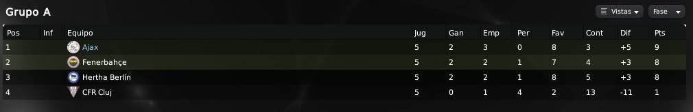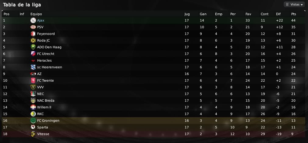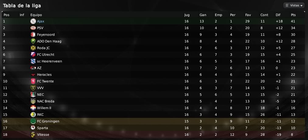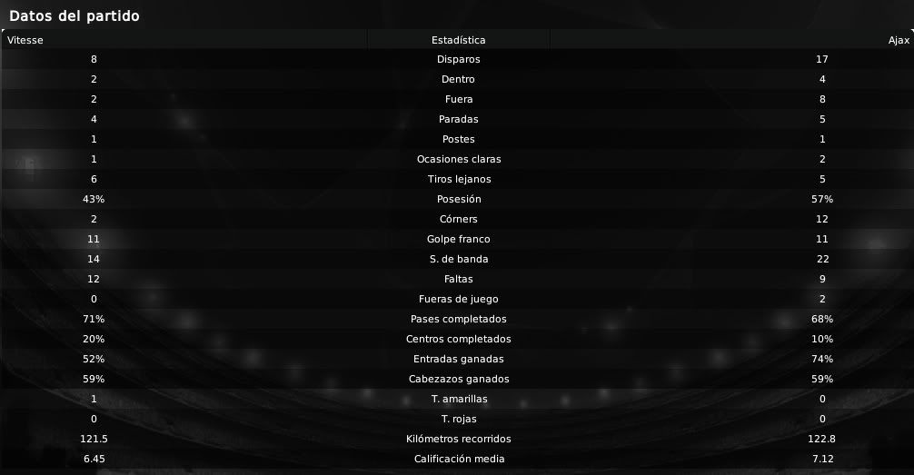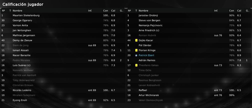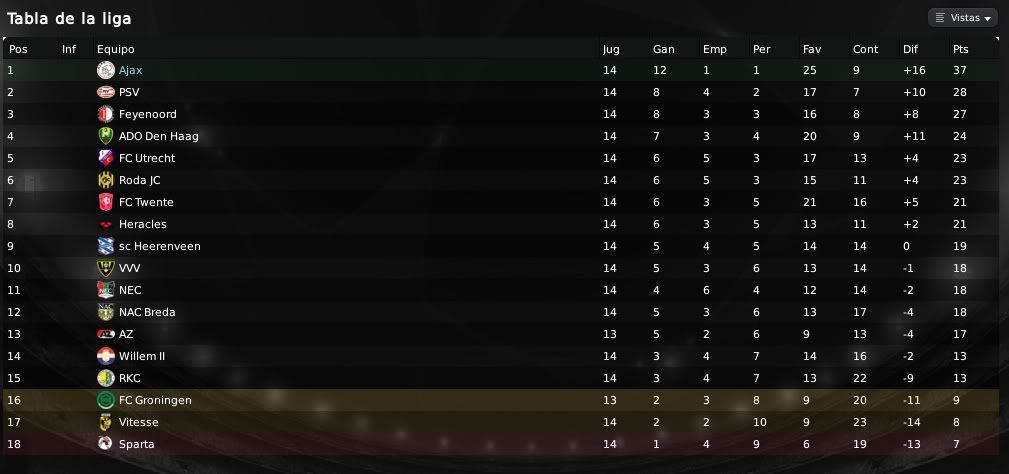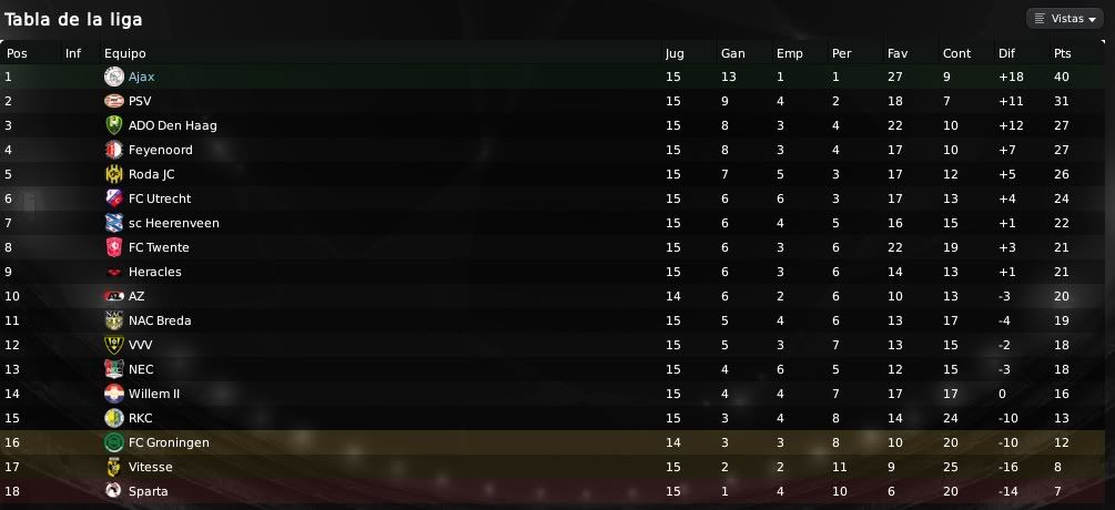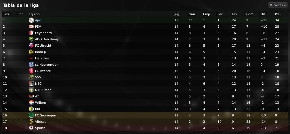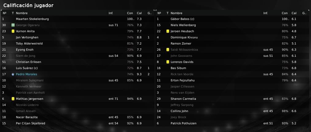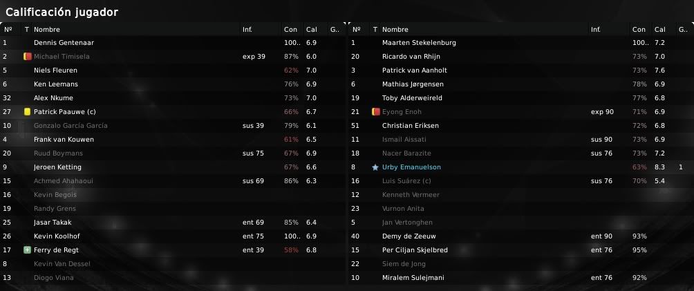 ) muestran las aspiraciones y el potencial de nuestra plantilla. Es cierto que no conseguimos marcadores excesivamente abultados y que es algo que se debe mejorar, por ello el equipo de scouting del equipo no deja de rastrear el mercado en busca de esos dichosos extremos que en cierto modo nos llevan por el camino de la amargura. Futbolistas como Barazite o Sulejmani están muy desperdiciados en la banda y es algo que debemos de solucionar. Respecto a las actuaciones individuales, Suárez está siendo el más destacado en los últimos encuentros. En los primeros meses no apareció en exceso pero ahora ya se está destapando como el crak y el goleador del equipo. También hay que reconocerle a Pedro Morales su buen hacer de cara a portería y no hay que olvidar que el chileno es ahora mismo nuestro máximo goleador. En defensa Vertonghen y Jorgensen siguen intratables, siendo dos pilares absolutos en nuestro sistema defensivo. Por otro lado, respecto a nuestra clasifiación en la Eredivisie y en la UEFA, la cosa no puede ir mejor. Salvo catástrofe no deberíamos de perder una ventaja de 9 puntos y todo está encaminado a que finalmente podamos salir campeones en nuestro país. En UEFA bueno, la cosa está muy de cara, pero debemos de ganarle al Hertha o como mínimo empatar para sellar el pase y ya veremos después que nos depara el sorteo. Un saludo y gracias por la visita amigo!