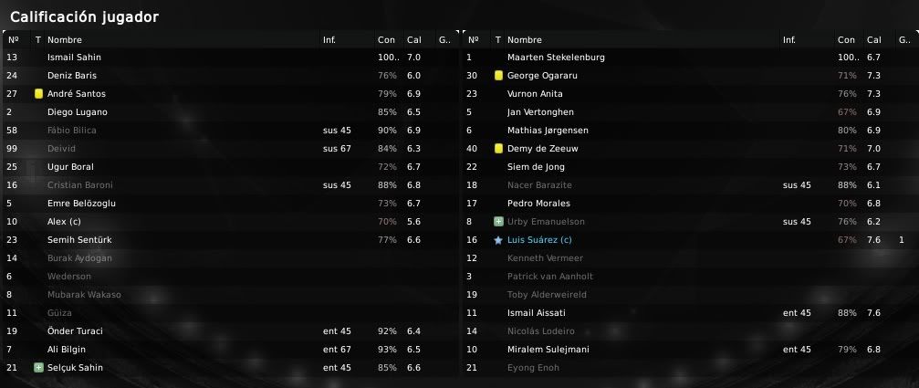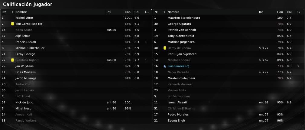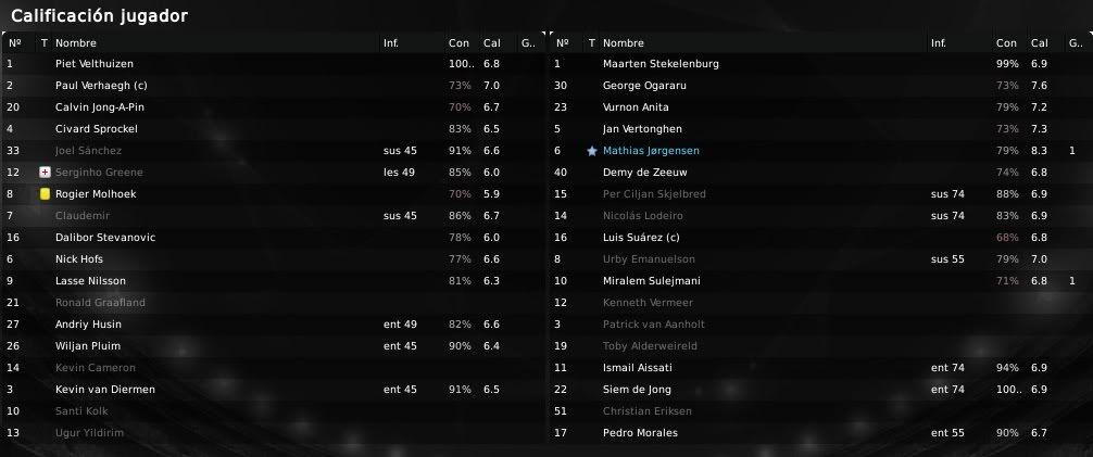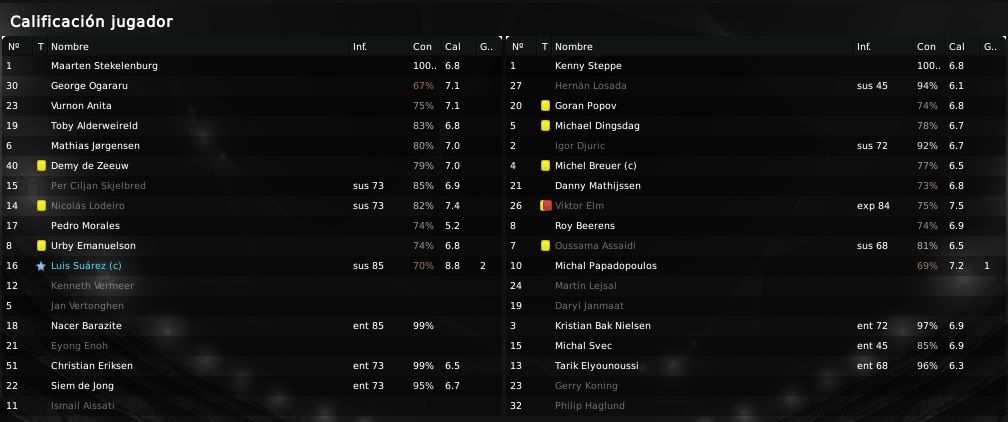 La actuación en general fue bastante buena, con Skjelbred y Lodeiro manejando al equipo de forma brillante y con Suárez arriba generando problemas constantemente. En el aspecto defensivo el partido también fue correcto y solo un despite de Toby Alderweireld permitió al Herenveen recortar distancias en la segunda mitad. Antes de eso, Suárez ya había marcado diferencias en la primera parte y en la segunda con dos goles que daban la victoria al conjunto local. Lodeiro también destacó dando dos asistencias que permitieron al delantero ajaccied hacer ese doblete, mientras que Morales por el contrario sería la nota negativa ya que falló un penalty en el tramo final y además estuvo inoperante durante los noventa minutos. En el Herenveen la presencia de Bereens producía cierto morbo debido a que el extremo había sido señalado como objetivo para el Ajax para el mercado de invierno. El jugador holandés fue de lo mejor de su equipo y realizó una actuación bastante aceptable, donde quedó de manifiesto su velocidad y su gran capacidad de desborde. Veremos si este partido ha servido para convencer a Rijkaard y el técnico se lanza a por su contratación.