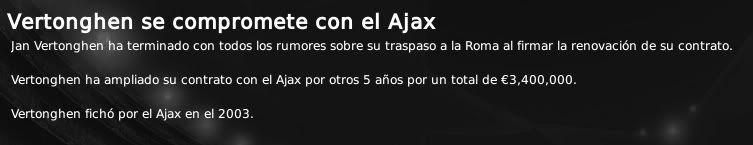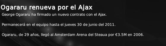 Otra decisión importante de cara al nuevo proyecto del Ajax. El equipo holandés, históricamente considerado un equipo vendedor, está decidido en esta nueva etapa a retener a sus mejores jugadores para no perder potencial e intentar llegar a lo más alto en Holanda y en Europa de la mano de su técnico Frank Rijkaard y de las perlas salidas de Toekomst. Si a principios de temporada el que renovaba era Christian Eriksen para alejarlo de un posible interés de la Roma, ahora ha sido el turno de Emanuelson y de Vertonghen que ya estaban siendo seguidos muy de cerca por equipos de la Liga Española y también por equipos potentes de Europa como es el caso del Bayern de Munich. Con estas renovaciones, además ampliar los compromisos de ambos con la entidad, se pretende mandar una declaración de intenciones: El Ajax va a cambiar, y se acabó eso de traspasar a los grandes jugadores de los que se dispone. Obviamente, todos los casos se pueden estudiar y si se trata de un jugador sustituible no se dirá "no" a un enriquecedor traspaso pero por el momento la idea del club es retener a los que Rijkaard considera los pilares actuales de la escuadra, entre los que se pueden citar a los ya mencionados Emanuelson y Vertonghen, Stekelenburg, Luis Suárez, Van der Wiel o de Zeeuw. Tanto Emanuelson como Vertonghen han renovado hasta 2014, manteniendo el mismo sueldo el jugador holandés (1,3 M€ anuales), y aumentándolo el jugador belga, que ahora pasará a cobrar 750.000 € anuales frente a los 450.000 que estaban estipulados en su anterior contrato. También hay que mencionar la renovación del lateral George Ogararu. El jugador rumano, de 29 años de edad, está demostrando en sus participaciones tras la lesión de Van der Wiel que tiene hueco en esta plantilla y que puede aportar experiencia y saber estar dentro de un vestuario donde pedrominan jugadores de una edad considerablemente inferior. Además, su sueldo ha sido rebajado en 100.000 € (ahora cobrará 500.000). Ogararu permanecerá en el equipo ajaccied hasta 2011. Asimismo, también se aprovecha esta noticia para anunciar que el Ajax ya ha iniciado los contactos con Luis Suárez para proponerle la renovación de su contrato. En los próximos días habrá noticias.