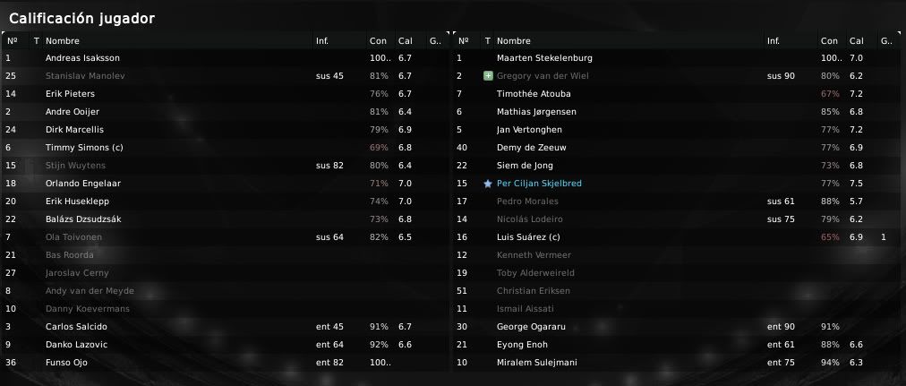 Por otro lado, en defensa, también están saliendo las cosas más o menos como se esperaba. La fuerte presión está siendo bien asimilada por todos los jugadores (especialmente por De Jong, jugador del que tendré que hablar en particular más adelante porque me está encantando) y, fruto de este buen trabajo en defensa, es el que consiguiéramos que el RKC no nos disparara a puerta en todo el partido jugando una buena parte del segundo tiempo con un hombre menos.