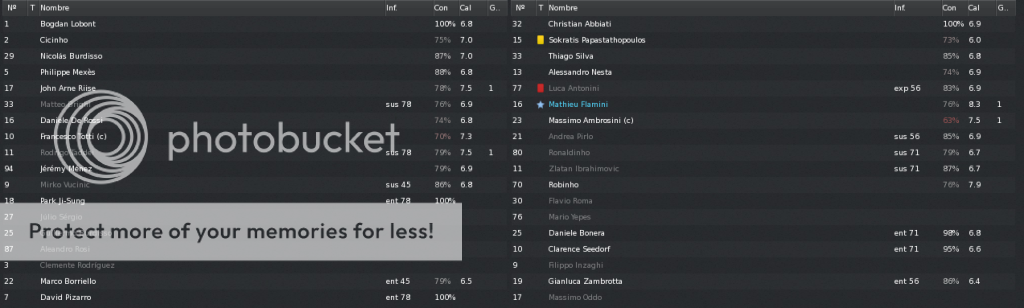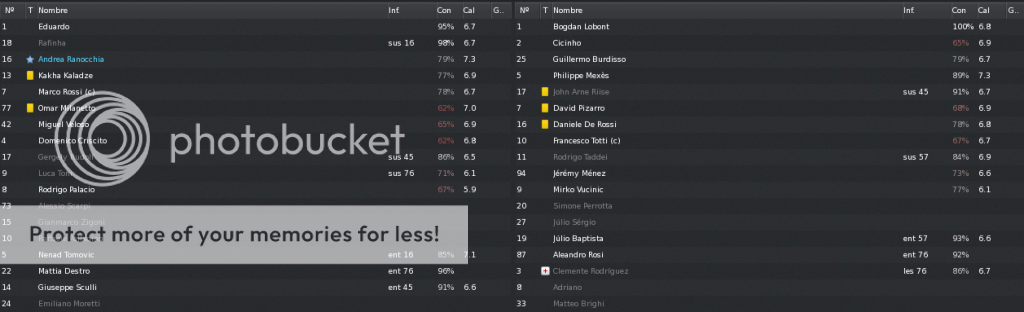 Andy1010: así es, lo de totti que dices ya lo he pensado, por el momento Ménez de buena manera así que mas tarde intentare con Totti en esa posición, igual es casi el único que no tiene labores defensivas, Borriello viene bastante bien, el problema que se lesiono rumbo al inicio de la campaña pero ya casi esta listo, volverá por ahí de la jornada 2 o 3 de la Serie A. Como le decía a alvarito, el propósito es llegar a los cuartos, pero eso es algo personal, la directiva pide octavos, pero estoy seguro que ya estando ahí se puede lograr, también depende en que lugar nos ubiquemos, eso podría facilitar o complicar nuestras aspiraciones, no es lo mismo quedar 2do en la fase de grupos y que te pongan con el Barcelona a quedar primero y te pongan con un equipo como el CSKA, digo en octavos ya todo es difícil pero hay niveles también xD