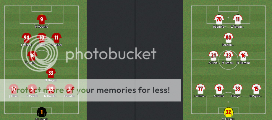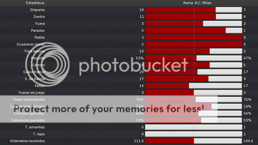 El partido no pudo comenzar de manera mas difícil para el equipo que apenas al minuto 13 se ponía atrás en el marcador con un golazo de Mathieu Flamini y apenas unos minutos despues el Milan anotaria el segundo tanto de Ambrosini en un buen centro de Robinho, sin embargo no cedimos y unos minutos después acortamos la distancia con lo cual nos íbamos al descanso con un poco de mejores ánimos. Regresando no aplicamos varios cambios, pero nos vino bastante bien la expulsión de Antonini que nos permitió mandar mas unidades al ataque adoptando una mentalidad ofensiva. El segundo de Riise llego en el mejor momento de la Roma cuando mas presionabamos y en momentos le dimos algo de baile al Milan, sin embargo no fue suficiente ya que no tuvimos la contundencia necesaria, ni Borriello ni Vucinic han estado atinados y nuestros delanteros están dejando bastantes dudas.