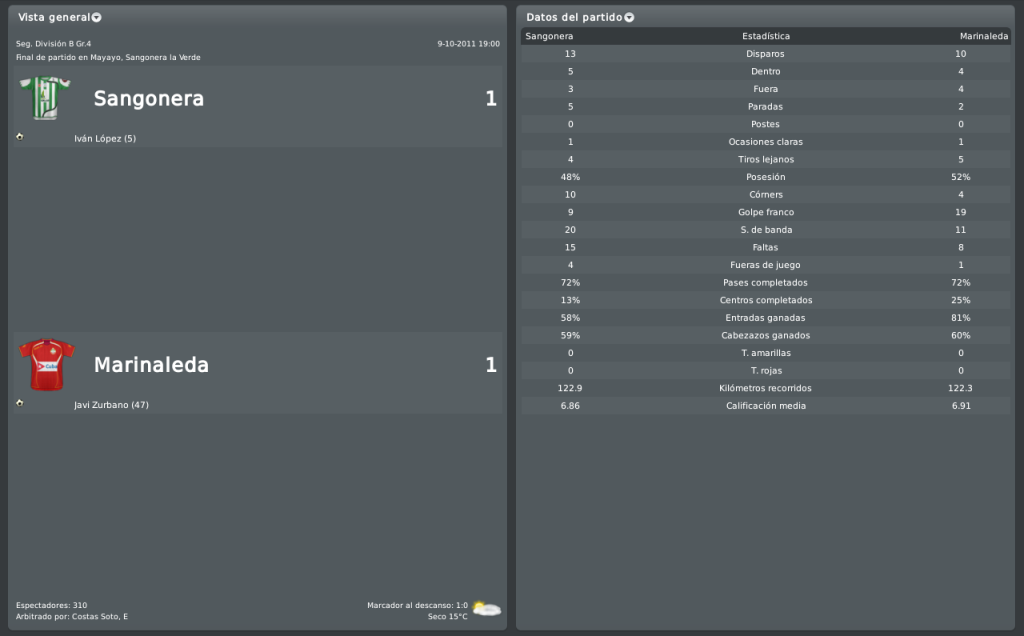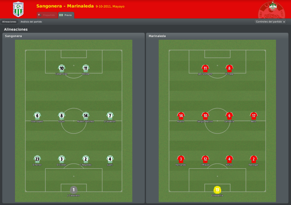 Crono.gif Llegamos al descanso con la sensación de haber jugado el partido completamente opuesto al de la semana pasada. En esta ocasión, los dominados hemos sido nosotros, con la diferencia de que hemos sabido aprovechar el grave error local y nos vamos con ventaja. Decido cambiar a Rojas por Sergio Marcos. El joven delantero asturiano se resiente de un choque con Sané y preferimos ser cautos para evitar que vuelva a recaer en su lesión. Sergio Marcos jugará de enganche, algo más retrasado que lo hacía Rojas en su función de segundo punta.