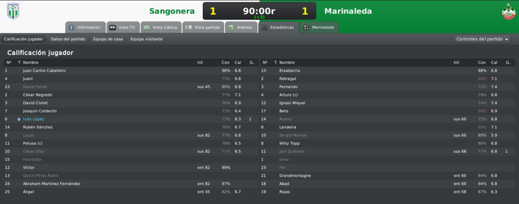 Crono.gif Nos vamos al descanso con muchas dudas sobre nuestro juego y pocos aspectos positivos que destacar. El Sangonera sin hacer nada del otro mundo nos está dominando claramente y está jugando muy cómodo. Pido más movilidad en ataque, que los interiores hagan más diagonales y que los laterales apoyen en ataque. Nos toca arriesgar aún más para intentar sacar algo positivo de este partido.