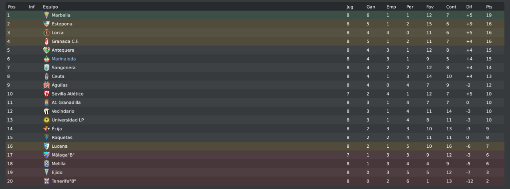 estrellarojapunto15pix.png El Marbella consolida su liderato. El conjunto marbellí goleó al Estepona, uno de sus perseguidores, y aumenta su ventaja a 4 puntos respecto del 2º y 3º, el Lorca y Granada, empatados a puntos. El Écija suma su tercera victoria consecutiva al derrotar por 1-2 al Vecindario, y se coloca en la mitad de la tabla, lejos de los puestos de descenso. El Sevilla Atlético, por su parte, ha completado una semana con 2 victorias. El filial sevillista venció el pasado miércoles por 2-5 al At. Malagueño en el partido que tenía aplazado por convocatorias internacionales, y también volvió a ganar este domingo por 2-1 al Antequera.