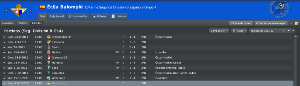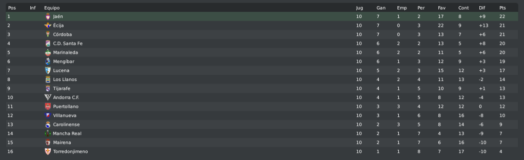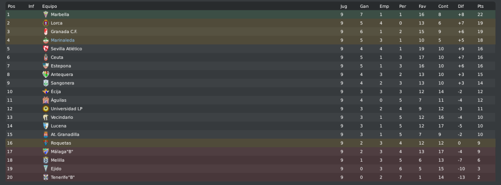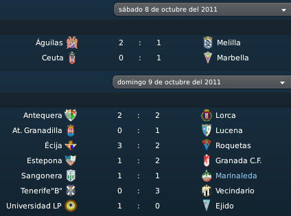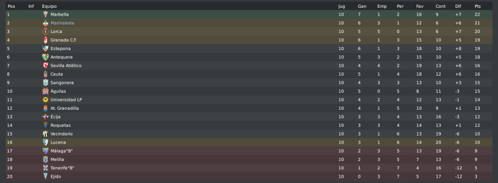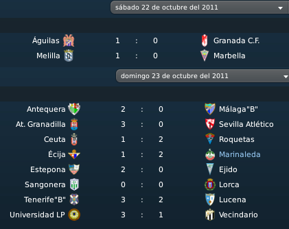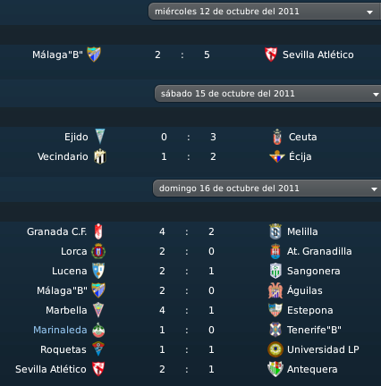 estrellarojapunto15pix.png Marinaleda y Lorca acechan al líder. Sorprendente pinchazo en Melilla del líder Marbella que acorta las distancias entre los equipos de arriba. Con nuestro triunfo, nos ponemos segundos a 1 punto del líder, mientras que el Lorca, que empató en Sangonera, baja a la tercera plaza a 3 puntos del Marbella. Otros resultados sorprendentes son la contundente victoria del At. Granadilla (3-0) al Sevilla Atlético y la primera victoria en liga del Tenerife B, que se impuso por 3-2 al Lucena. El Poli Ejido vuelve a perder en Estepona y se convierte en el único equipo del Grupo IV que sigue sin conocer la victoria tras 10 jornadas disputadas.