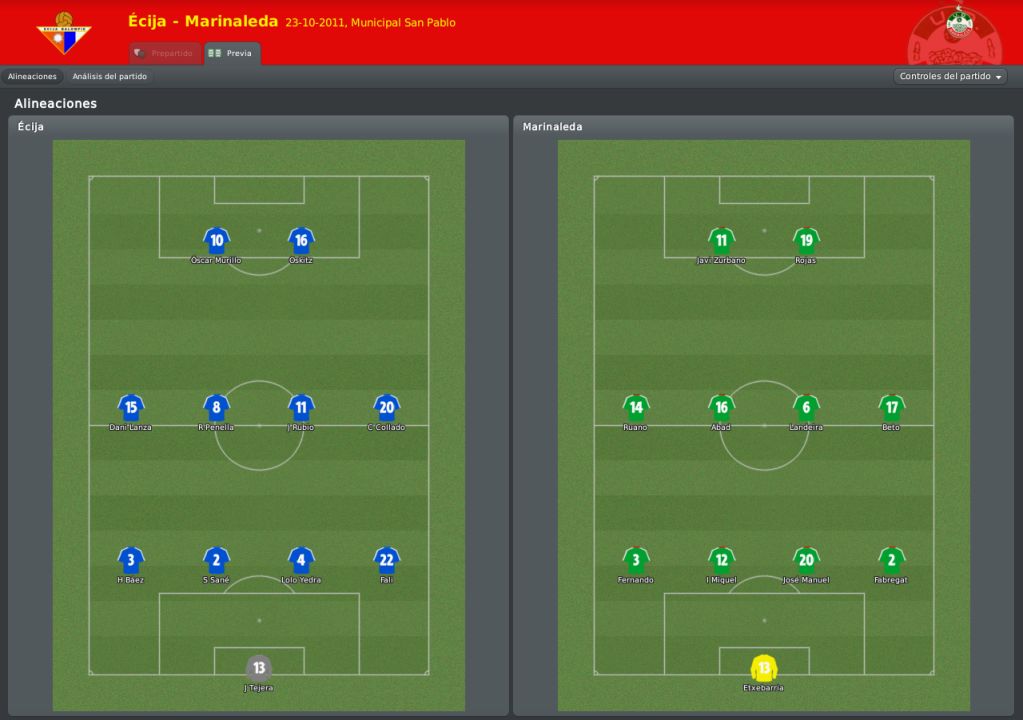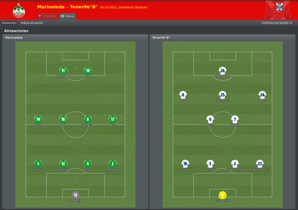 tactica.png Las lesiones de Samuel y Topp nos obligan a salir con una delantera inédita hasta ahora: Rojas, que debuta como titular, junto a Javi Zurbano. El otro cambio que hago en el once inicial es la entrada de Abad en el centro del campo en detrimento de un gris Sergio Marcos. El resto, los mismos que sacaron un puntito en Sangonera. En el banquillo la novedad es Rama, que vuelve a una convocatoria tras 3 semanas lesionado.