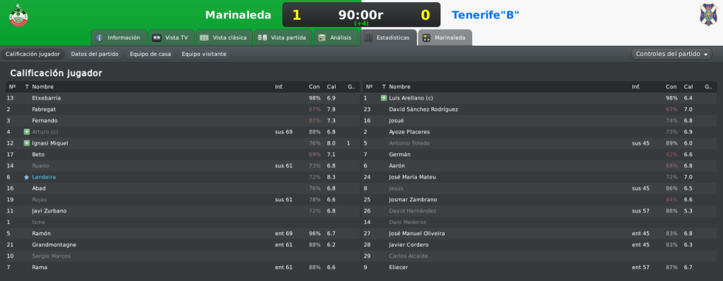 Pues sí, en estos partidos que te salen malos lo importante es llevarte los tres puntos. También salgo satisfecho con la forma en que hemos dominado el partido, en especial la posesión del balón, aunque tampoco es para tirar cohetes porque el Tenerife B está muy muy mal. Ya abrimos trecho con los de abajo y eso es bueno, aunque aún queda mucho y con una mala racha que pillemos (y todos los equipos las pillan) ya estamos otra vez en el lío.