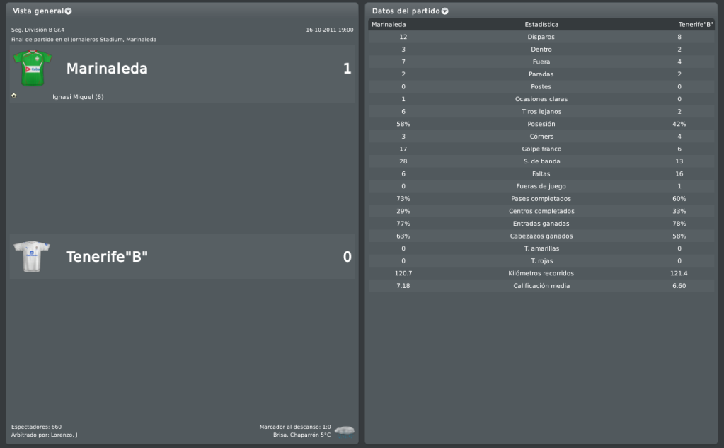 Crono.gif La segunda parte se le hizo eterna al respetable, ya que nuestra posesión era mayoritariamente estéril, muy horizontal y con ataques muy poco fluidos. El Tenerife B, por su parte, apenas mostró argumentos para contradecir su puesto como colista. Lo mejor del partido, que sumamos 3 puntos y subimos hasta la 4ª plaza que nos daría derecho a jugar el playoff de ascenso.