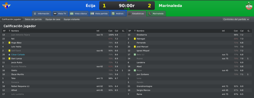 Otra victoria que nos sirve para seguir avanzando, ya a 9 sobre el descenso, y ahora a preparar el derby contra el Ecija. Siempre soy temeroso ante este tipo de partidos de rivalidad, en los que por muy mal que este el rival, nunca hay favoritos, pero en esta ocasion veo que el Marinaleda puede sacar una victoria jeje a ver como se da la cosa.