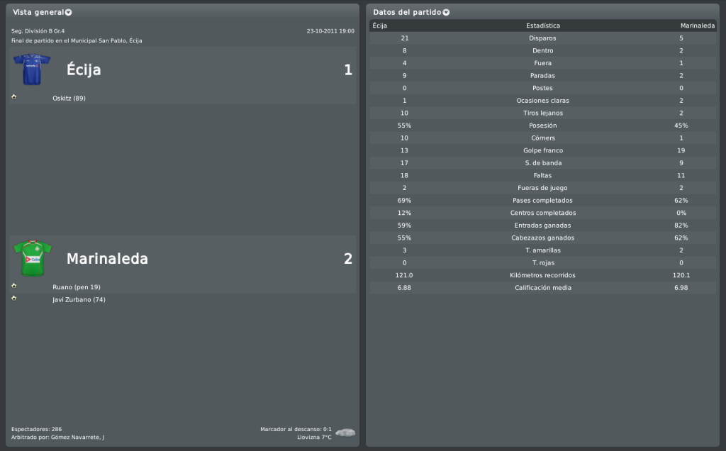EscarapelaMar10px.png Hasta que la jugada tonta del partido lo cambió todo. Fernando se saca un buen centro desde la izquierda buscando la cabeza de Beto que es despejado por Sané al más puro estilo de jugador de voleibol. El árbitro no duda y señala el claro penalti, ante las protestas de jugadores y afición local. Ruano toma la responsabilidad y anota en nuestro primer tiro a puerta. A partir de ahí, al Écija le pudo la urgencia por empatar y se vino aún más arriba pero sin generar peligro. Nos dedicamos a despejar sus previsibles centros al área y a forzarles a tirar desde muy lejos, con lo que Etxebarria no sufrió. Buenos minutos de José Manuel en el centro de la defensa y de Fernando en la izquierda.