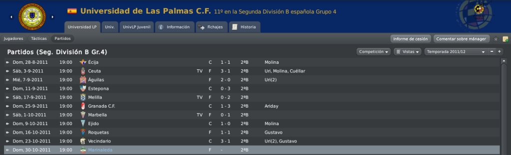 EscarapelaMar10px.png La próxima semana nos visita una de las mejores plantillas del Grupo IV. La Universidad de Las Palmas es un equipo hecho con la idea de volver a Segunda, hito que estuvieron a punto de conseguir la temporada pasada hasta que toparon en playoff con el Alcorcón. Esta temporada está teniendo un arranque bastante irregular, aunque en las últimas jornadas parecen haber encontrado una buena línea de juego y resultados, ya que suman 7 de los últimos 9 puntos.