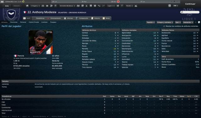 22. Modeste Inédito esta campaña, una grave lesión en la rodilla durante el primer partido de la pretemporada ha dejado sin debutar en Liga al nuevo fichaje del equipo. De todos modos, es un joven de cualidades aceptables, aún en desarrollo.