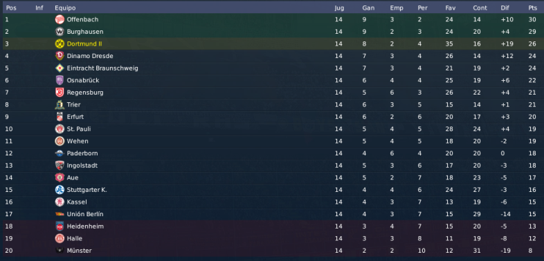 Parece que los chavales del Dortmund II le han cogido pronto el ritmo a la categoría y suben posiciones jornada a jornada. Sólo un par de derrotas tuvieron en este par de meses con algunas goleadas escandalosas y un rendimiento sobresaliente de muchos de estos jovenes encontrando mucha facilidad para marcar goles, algo que parecen heredar del primer equipo aunque en el último mes no vieron mucha puerta que digamos. El Dortmund II va camino de hacer otro gran año.